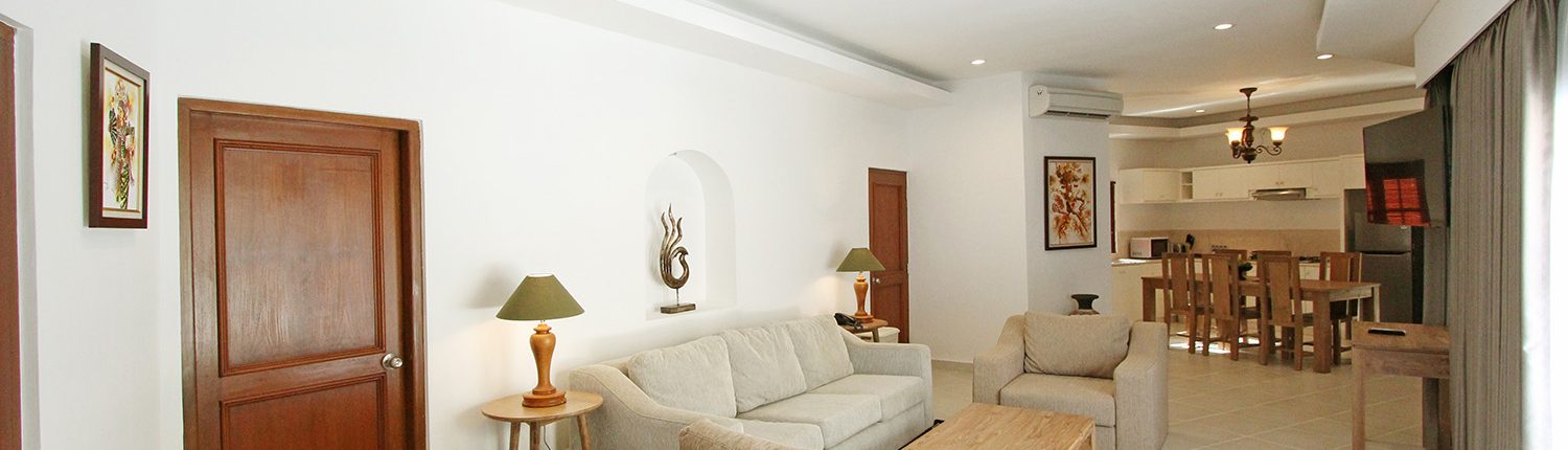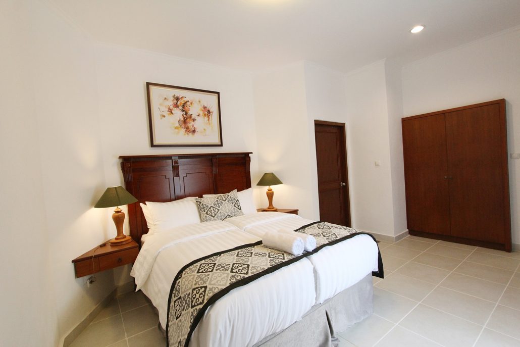 The villa configuration is 3 bedroom inside and one bedroom outside the villa. This 4 Bedroom villas is also provided with gazebo house which can make relax the guest and family after long day activity. The private pool can be access directly from the livingroom, also from the main room.